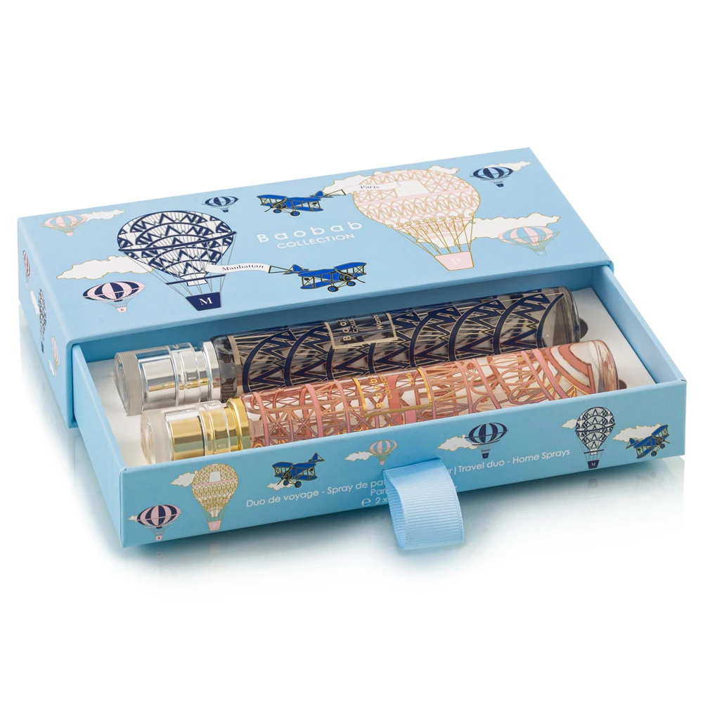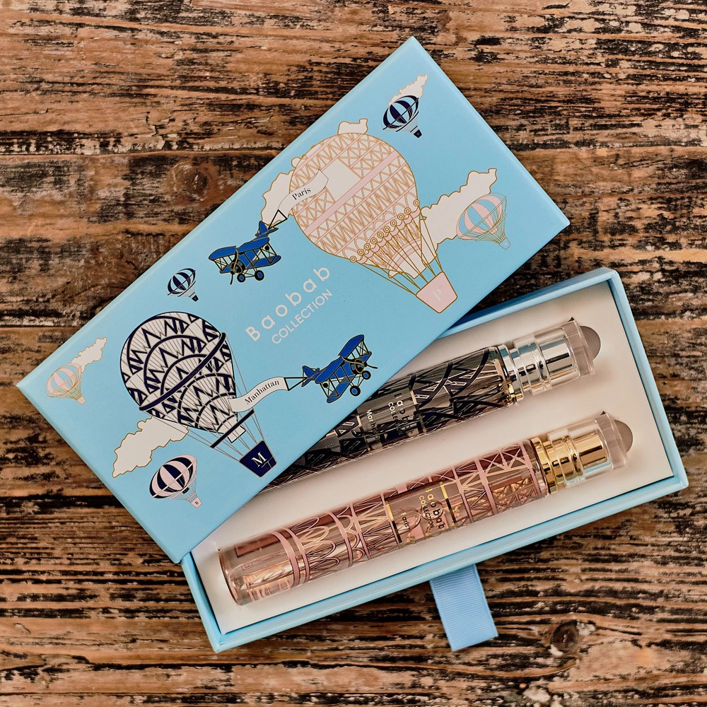 • Features two 44 ml room sprays, Manhattan and Paris, presented in a turquoise box adorned with hot-air balloons and silk-screen prints of each city
