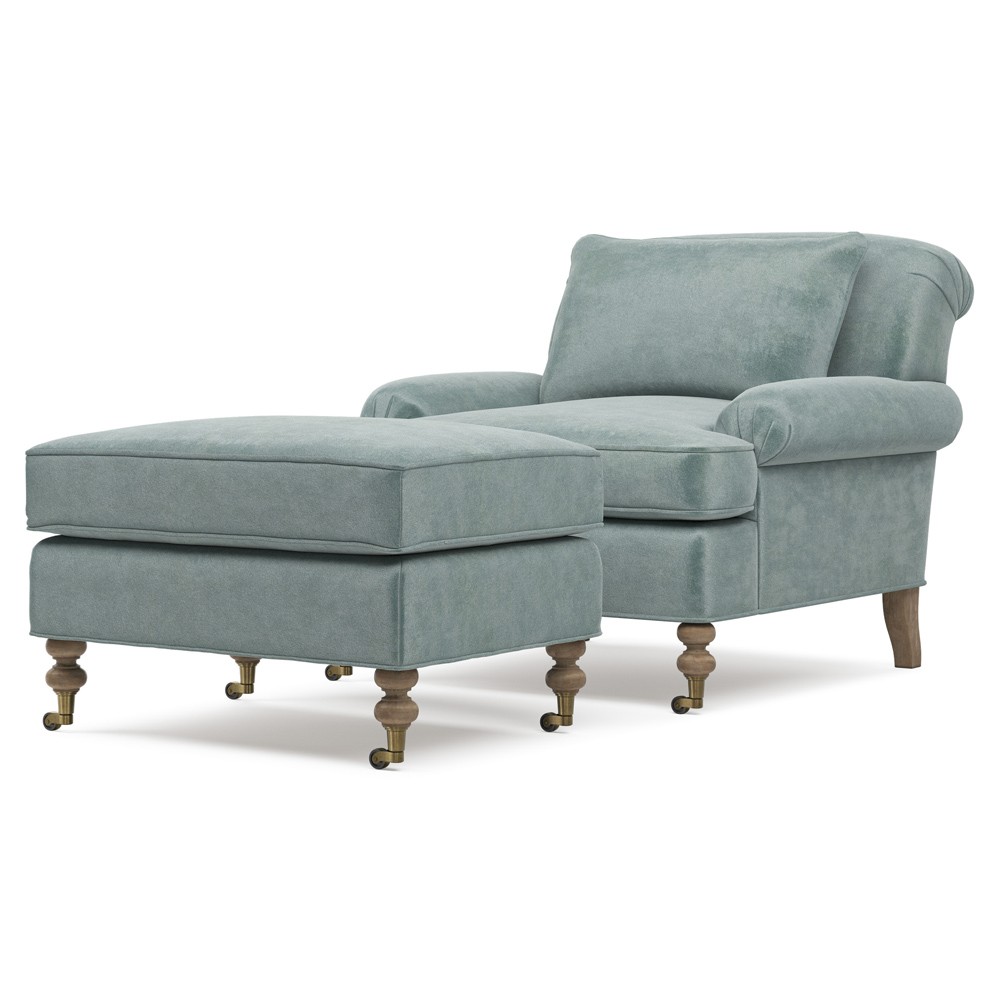 • Upholstered in heron light blue velvet performance fabric. Fabric content: 82% polyester and 18% cotton; Rub count: 99,000