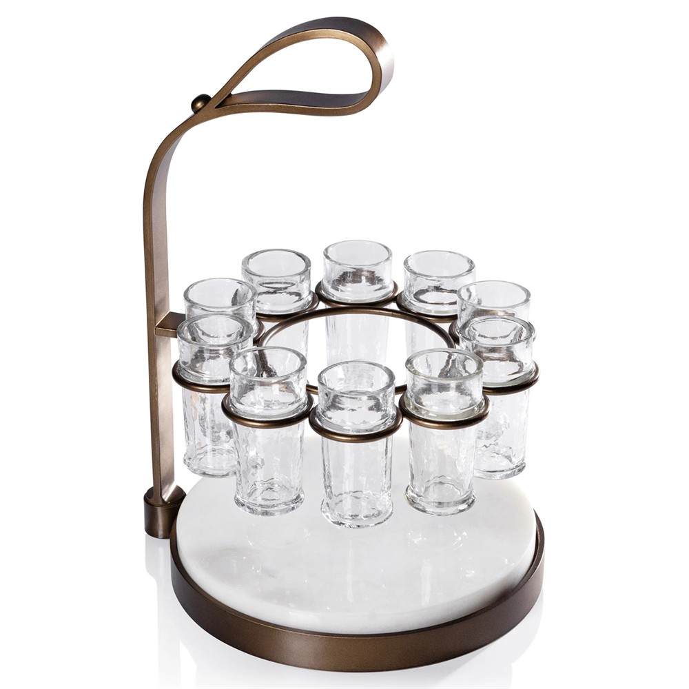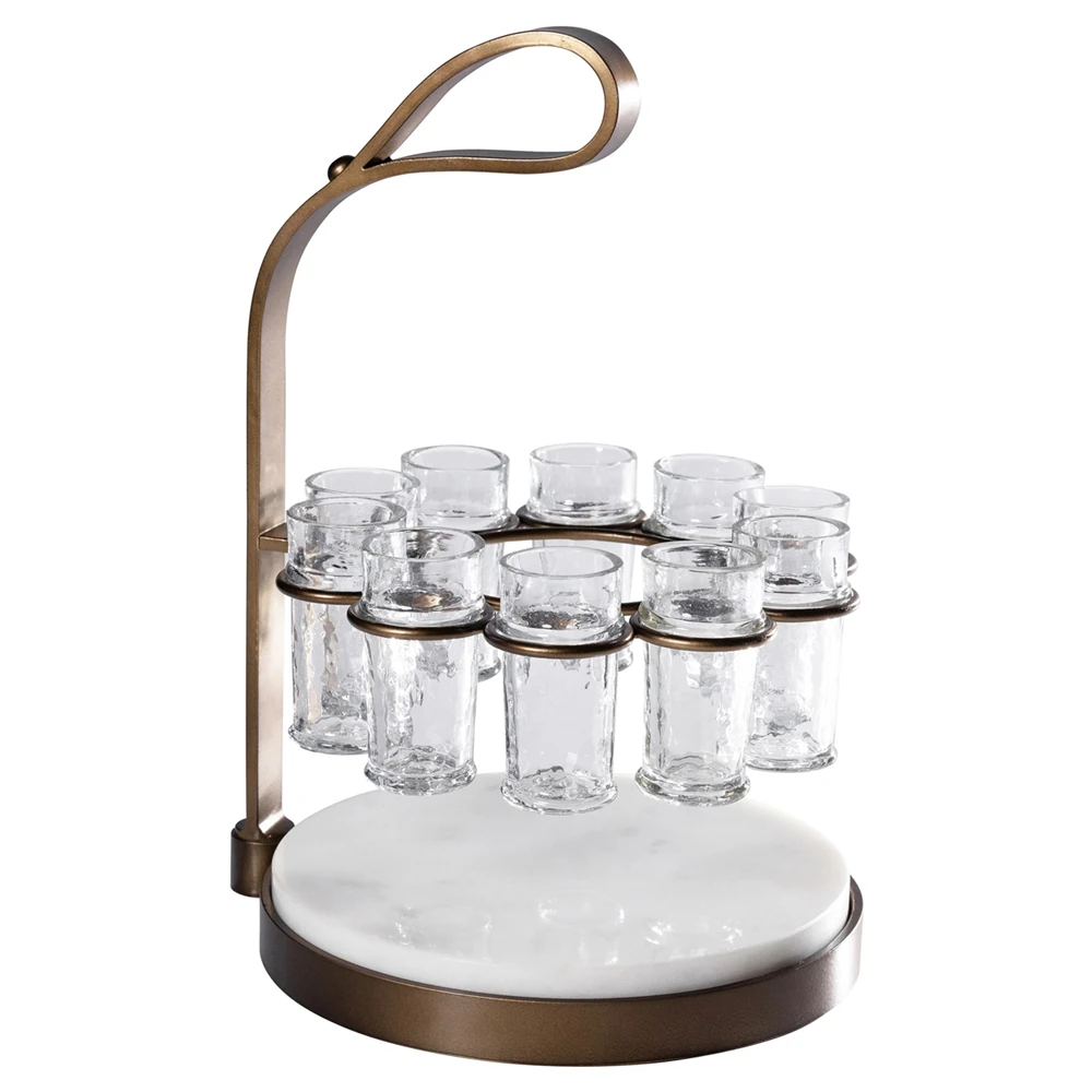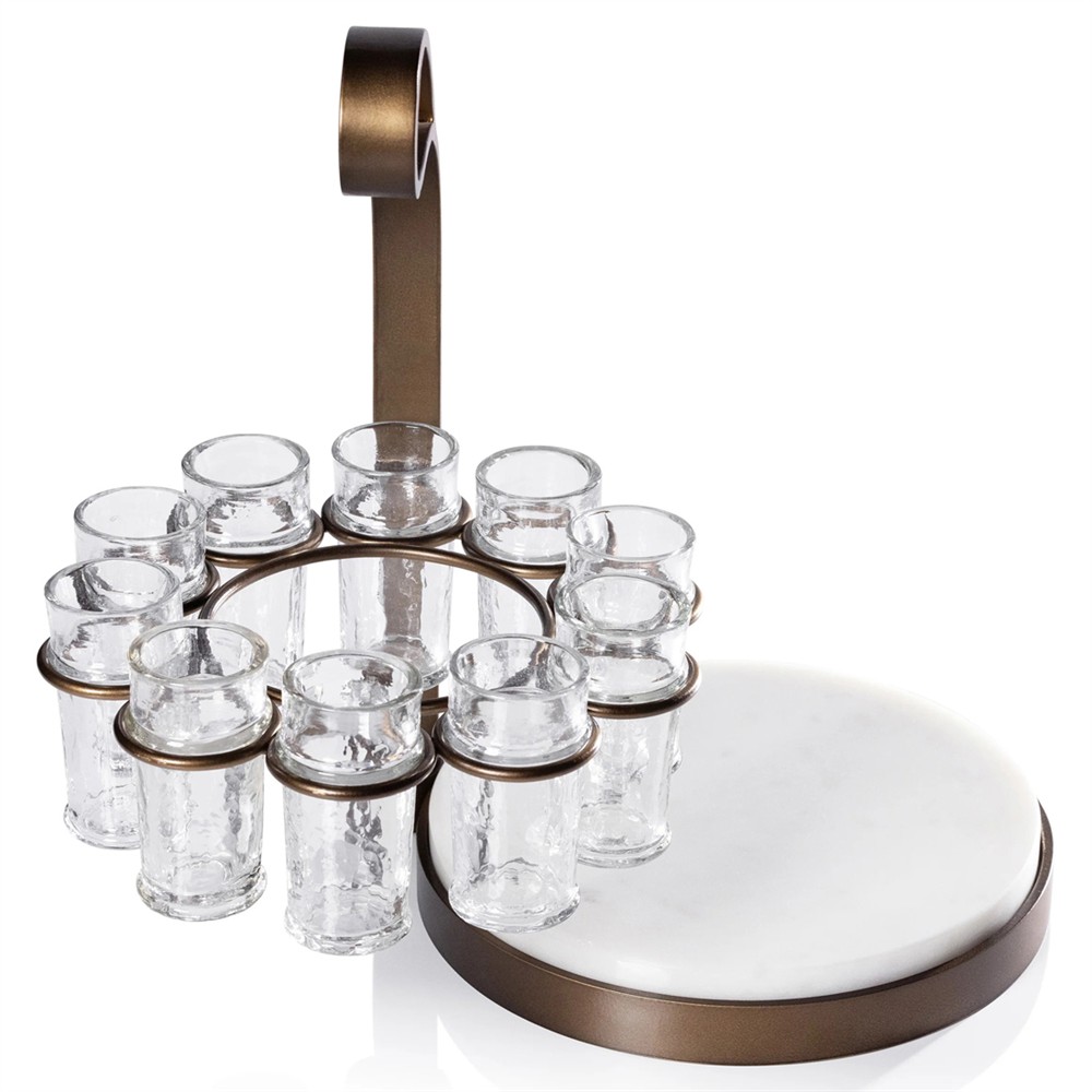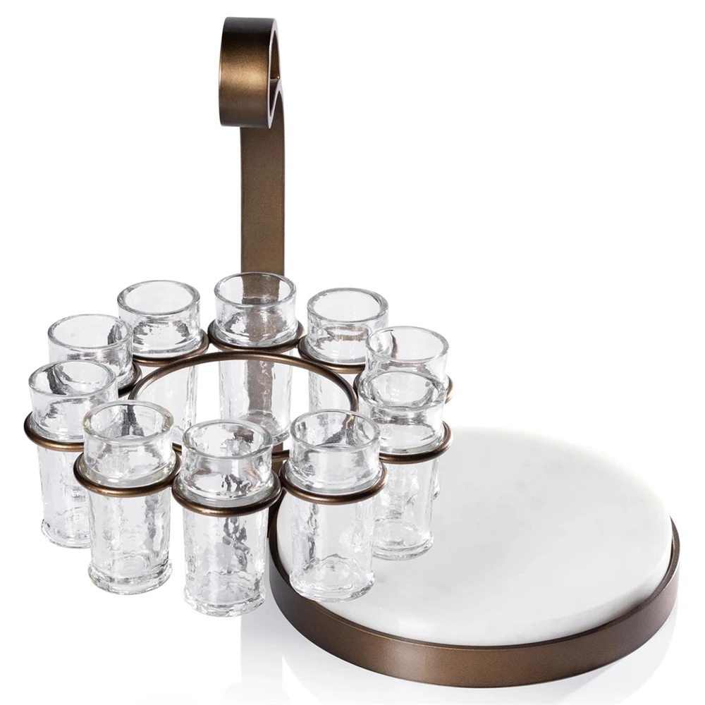• Set includes 10 shot glasses and a Banswara marble cutting board