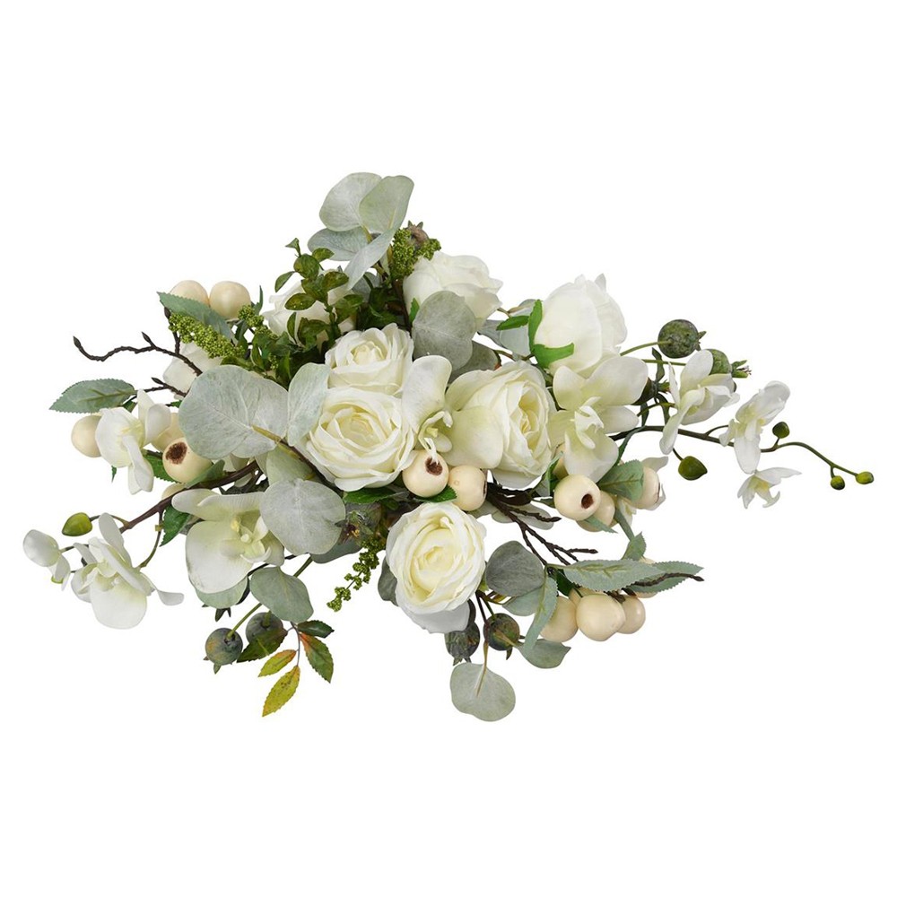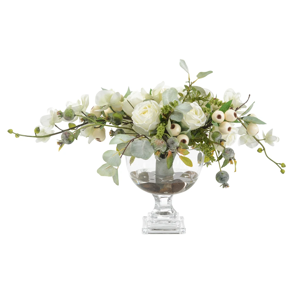 • Features a clear glass pedestal bowl with white roses, berries, eucalyptus, phalaenopsis orchids, rolled marble rock, and faux water