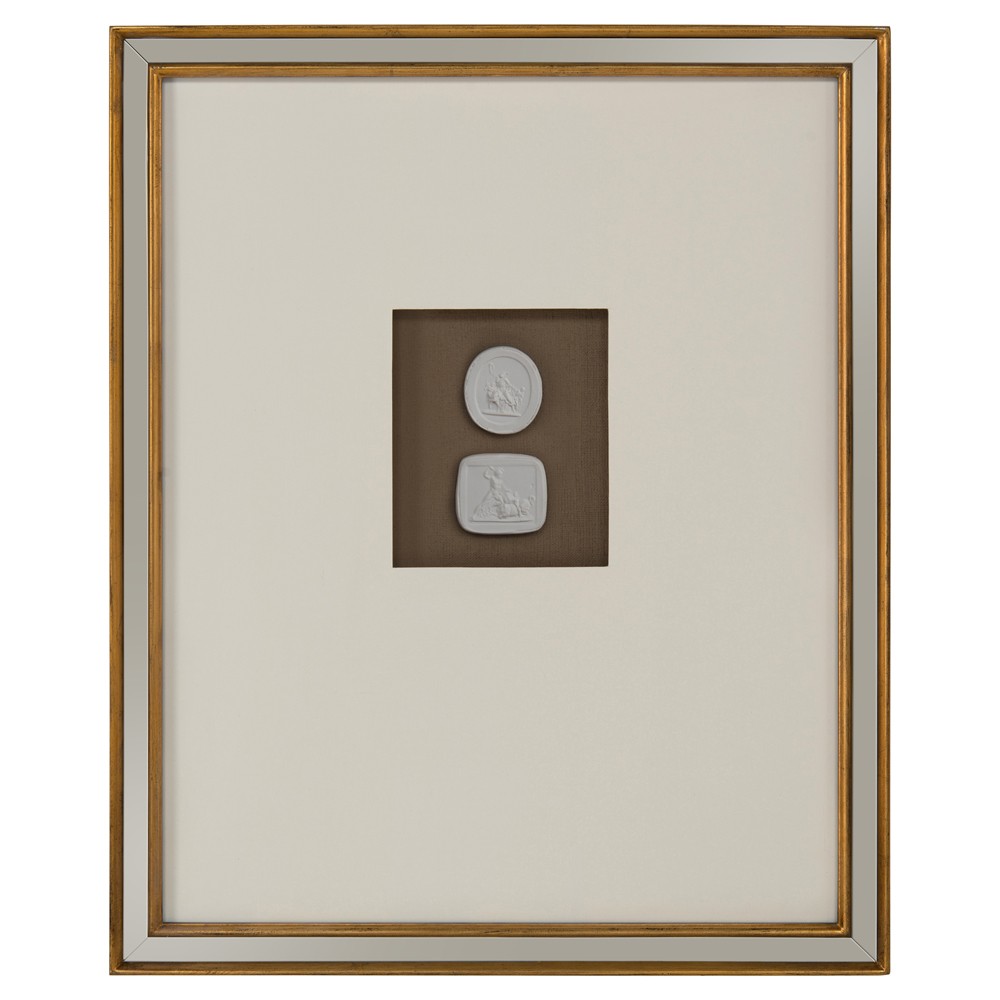 • Features hand-cast plaster intaglios mounted on painted fabric, complemented by an ivory mat and mirrored frame