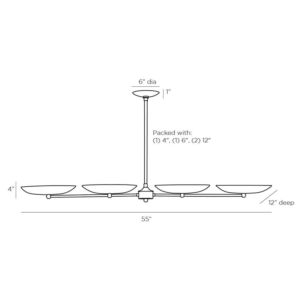 • Maximum hanging height: 44 inches; Canopy: 1 inch high x 6 inches deep x 51 inches wide; Pipe chain: (1) x 4 inches , (1) x 6 inches, (2) x 12 inches; Clear/silver SVT cord length: 10 feet
