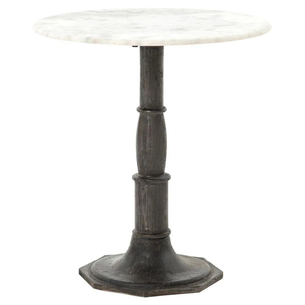 Hervey French Country White Marble Top Dark Grey Iron Pedestal Round Side Table