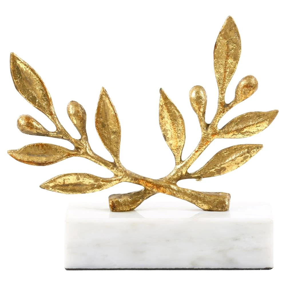 Olive Branch Gold Leaf Metal White Marble Base Sculpture
