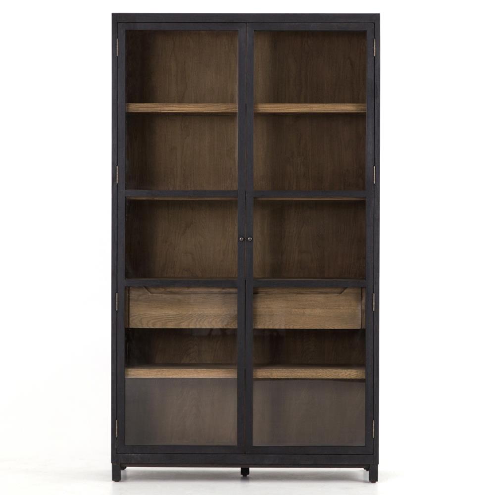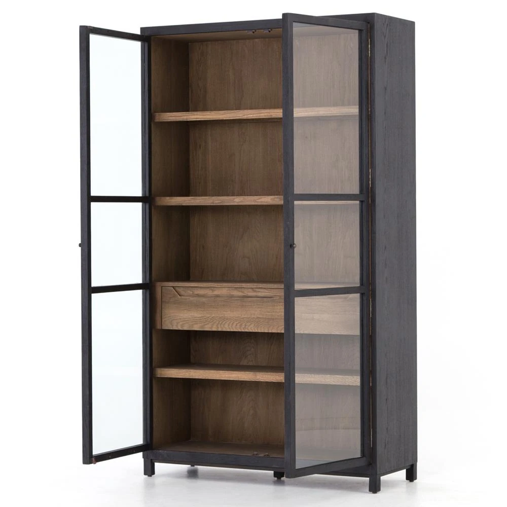 • Features 2-tone transparency; Has back drifted oak frames lighter interior shelving for subtle but striking contrast