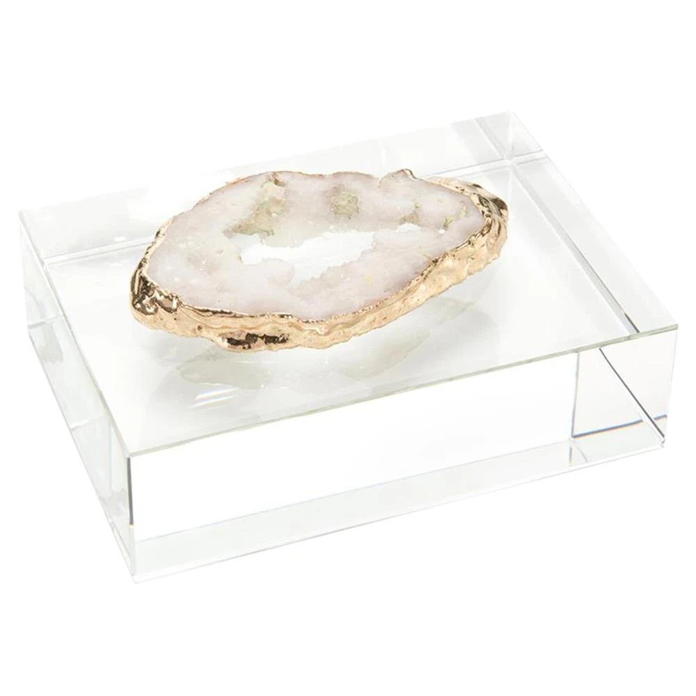 • A white with gold plating geode slice is mounted on a clear lead free crystal block