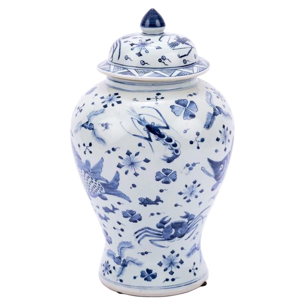 Aspen French Country Blue and White Porcelain Fish Shrimp Crab Ginger Jar