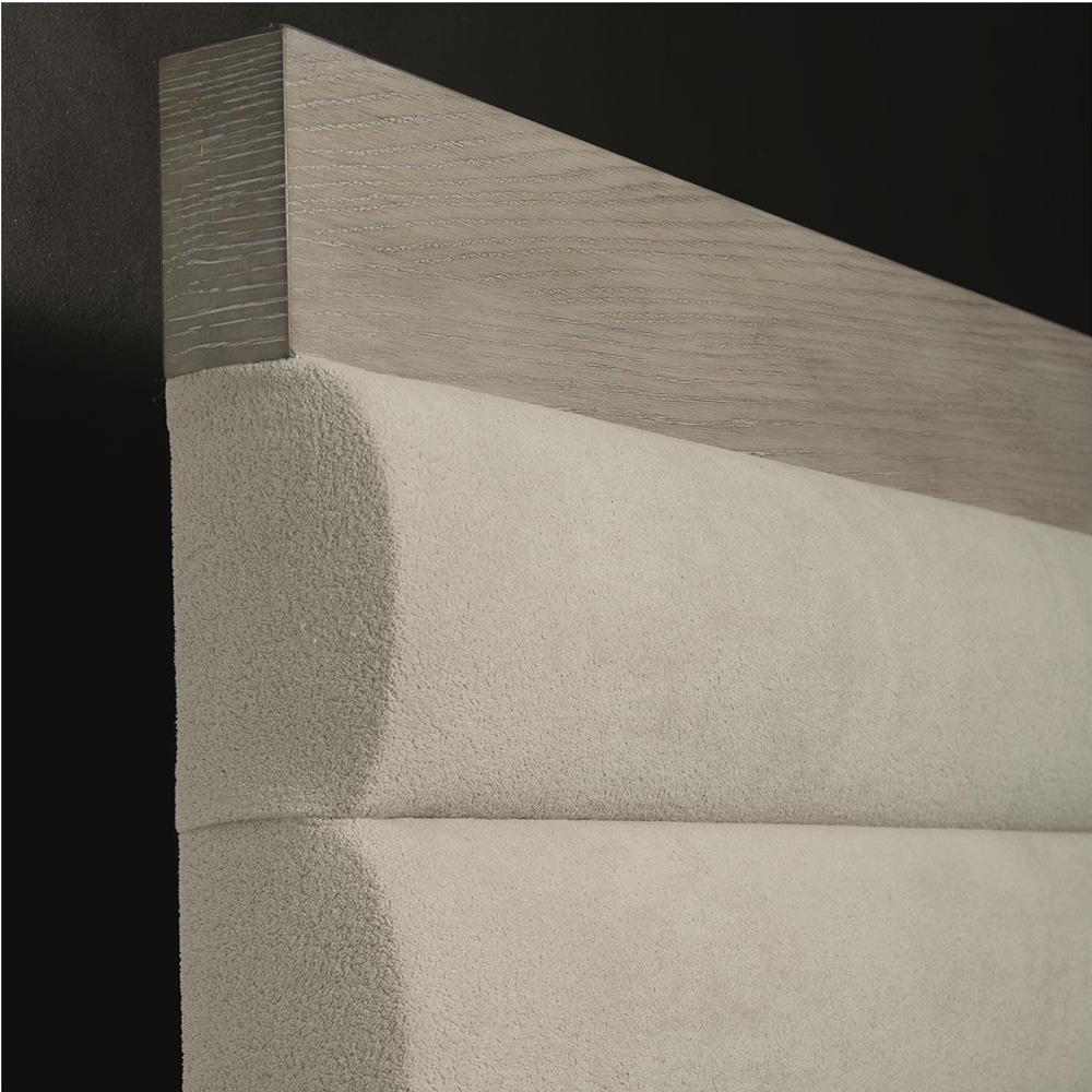 • Wood-framed headboard with upholstered inset panel containing five horizontal channels; Wood footboard and side rails