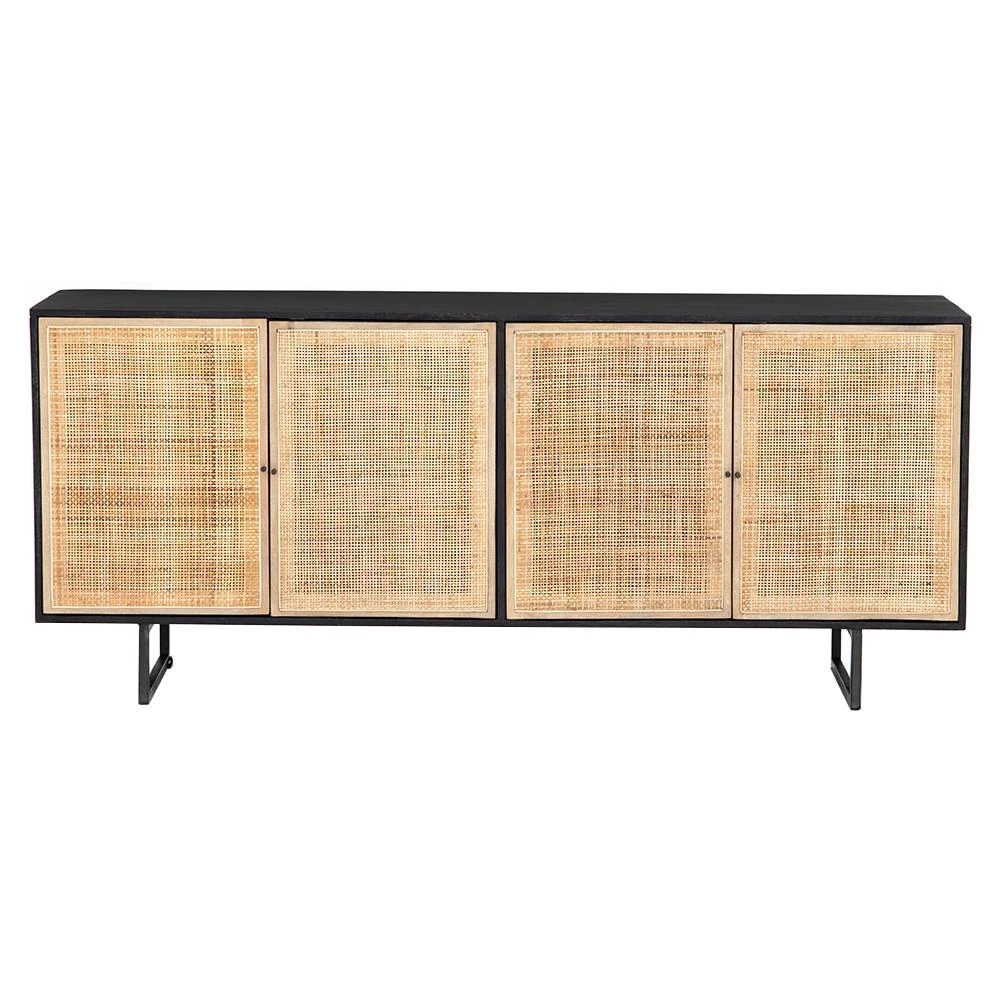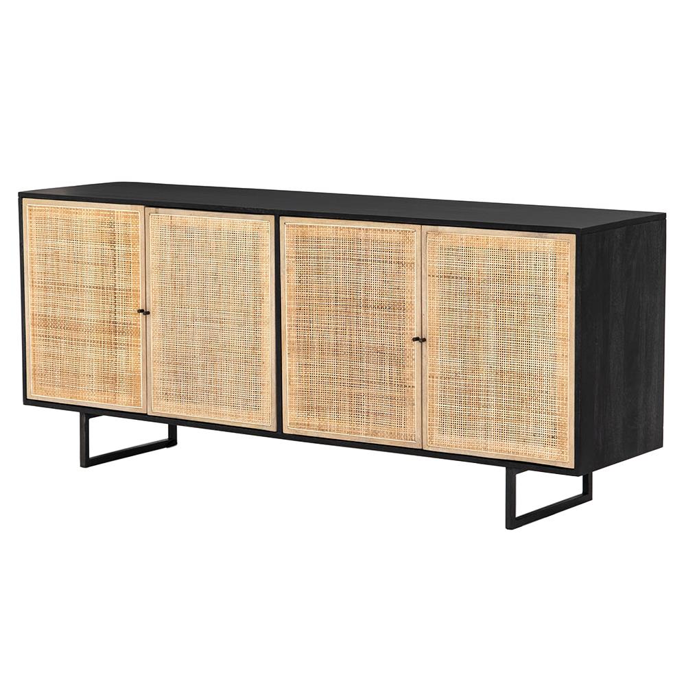Emilie Coastal Beach 4 Door Black Wash Mango Wood Cane Metal Legs Sideboard