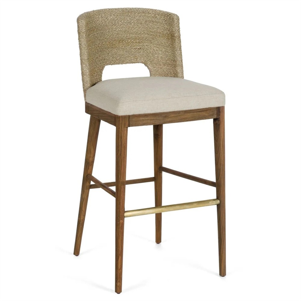 Adelyn Coastal Brown Teak Handwoven Seagrass Back Grey Performance Counter Stool