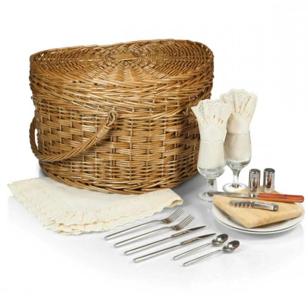 • Basket includes (2) x 8 inches diameter porcelain plates, (2) x wine glasses, (1) 6x6 inches hardwood cutting board, (2) sets of cutlery (stainless steel forks, knives, and spoons), (2) 14x14 inches cotton napkins, (1) stainless steel waiter-style corkscrew with wooden handle, (1) set of stainless steel salt and pepper shakers, (1) plastic food storage container, (1) stainless steel cheese knife with wooded handle, and (1) 44x44 inches cotton tablecloth