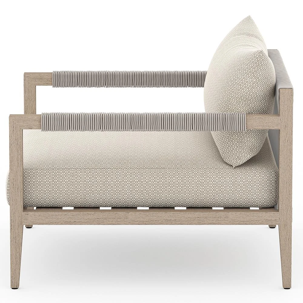 • Cheryl Modern Light Grey Cushion Woven Rope Natural Teak Outdoor Dining Arm Chair|Kathy Kuo Home