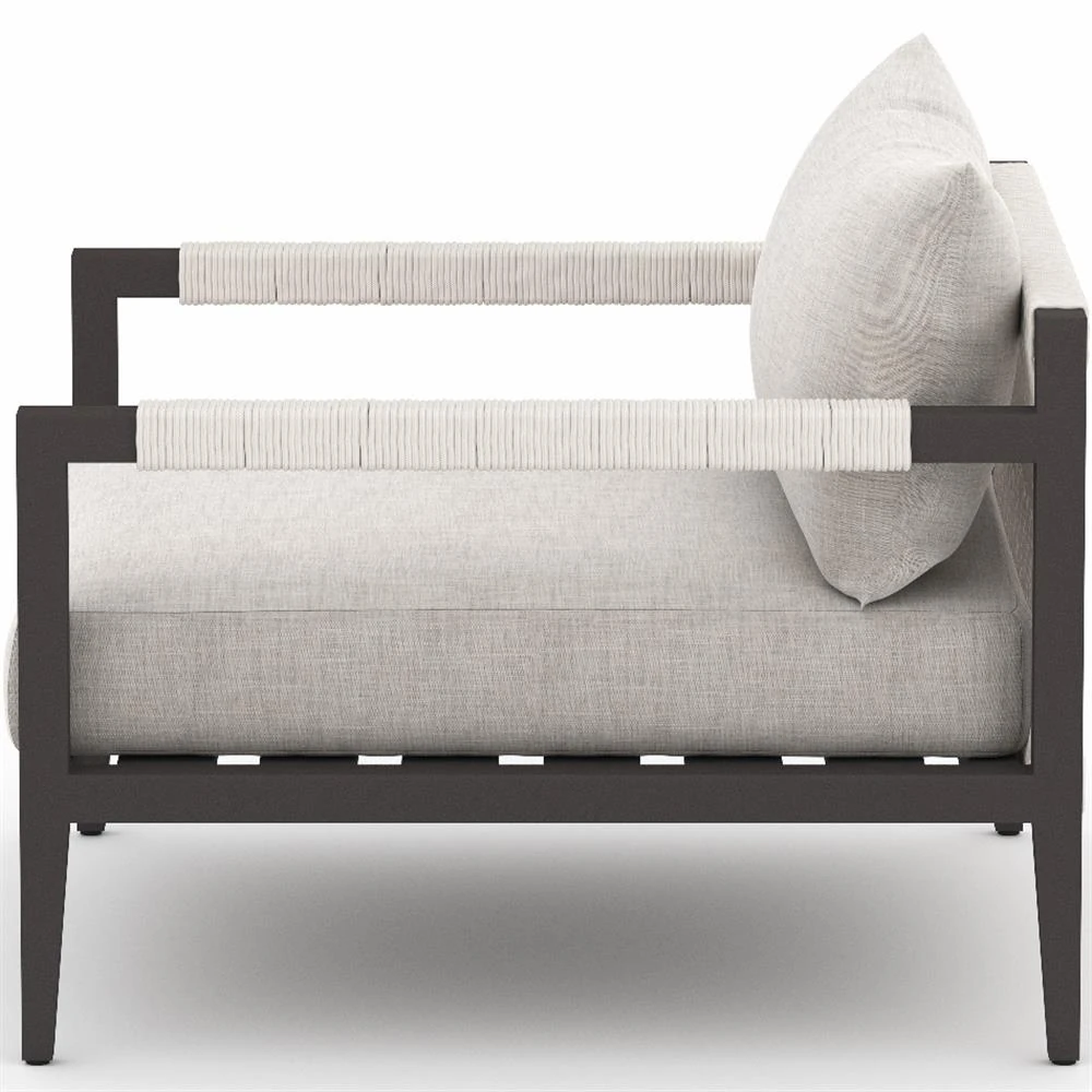 • Cheryl Rustic Lodge Beige Upholstered Black Aluminum Outdoor Sofa - Small - 63"W|Kathy Kuo Home