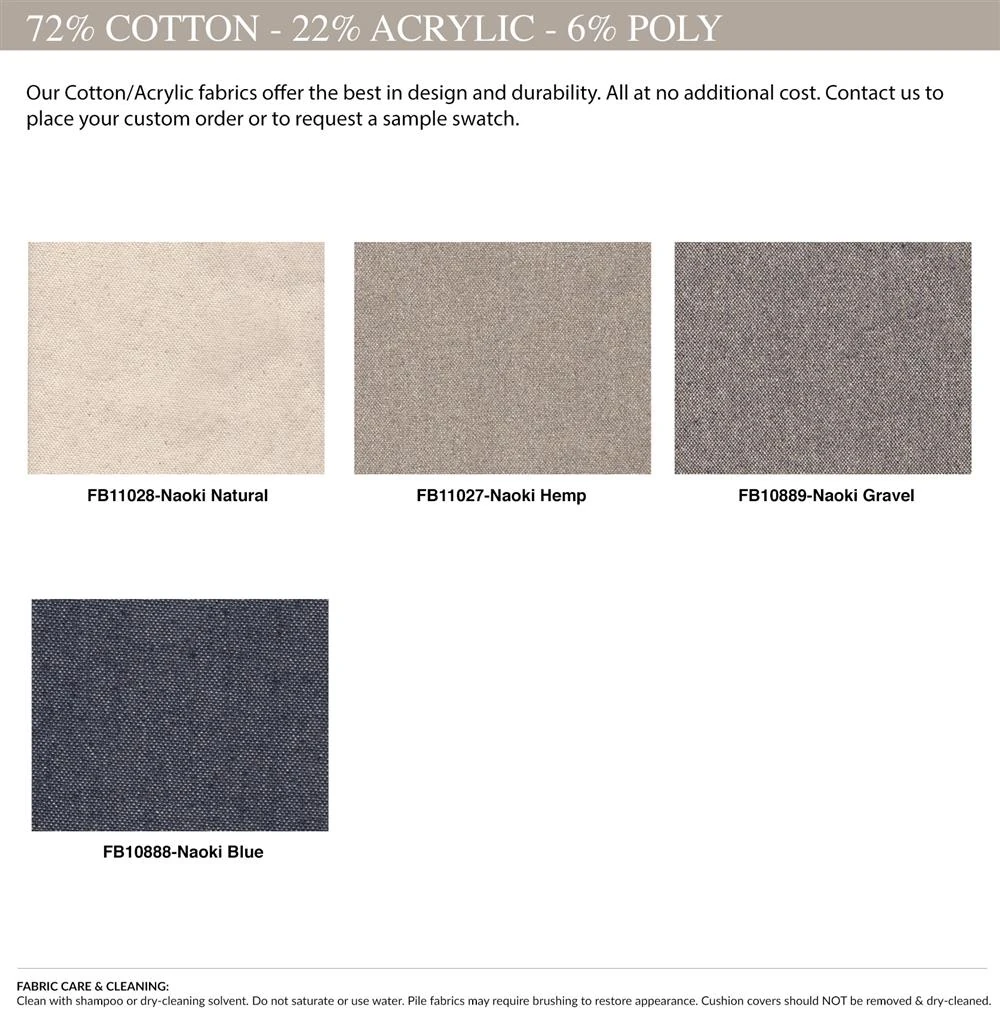• Upholstered in GǣMolino Ivory" fabric. Fabric content: 100% cotton. Fabric is not treated with ScotchguardG?
