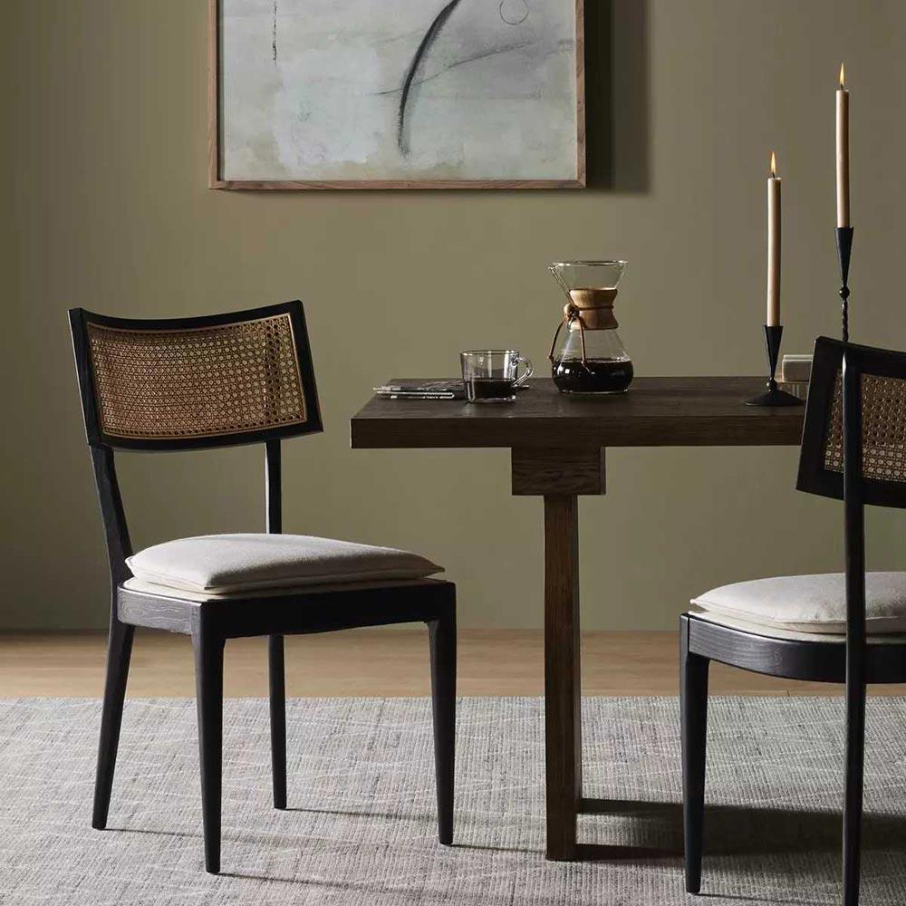 • Ronan Coastal Beige Upholstered Seat Woven Rush Brown Oak Wood Dining Side Chair|Kathy Kuo Home