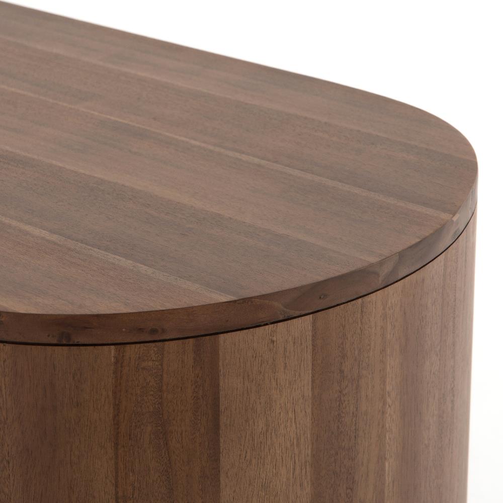 • Half cylinder shaped legs contain open interior shelves for additional storage