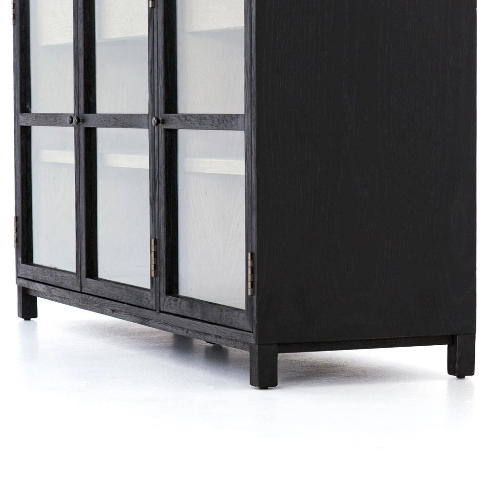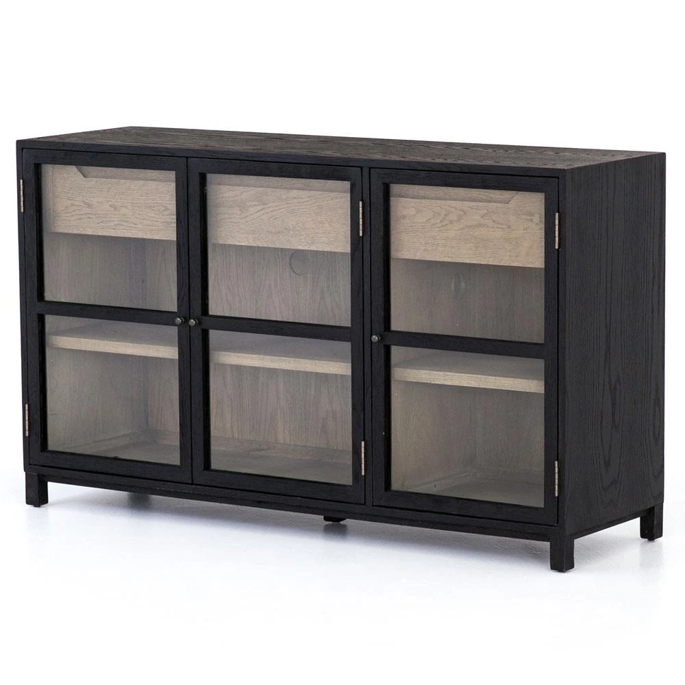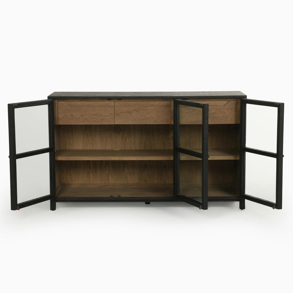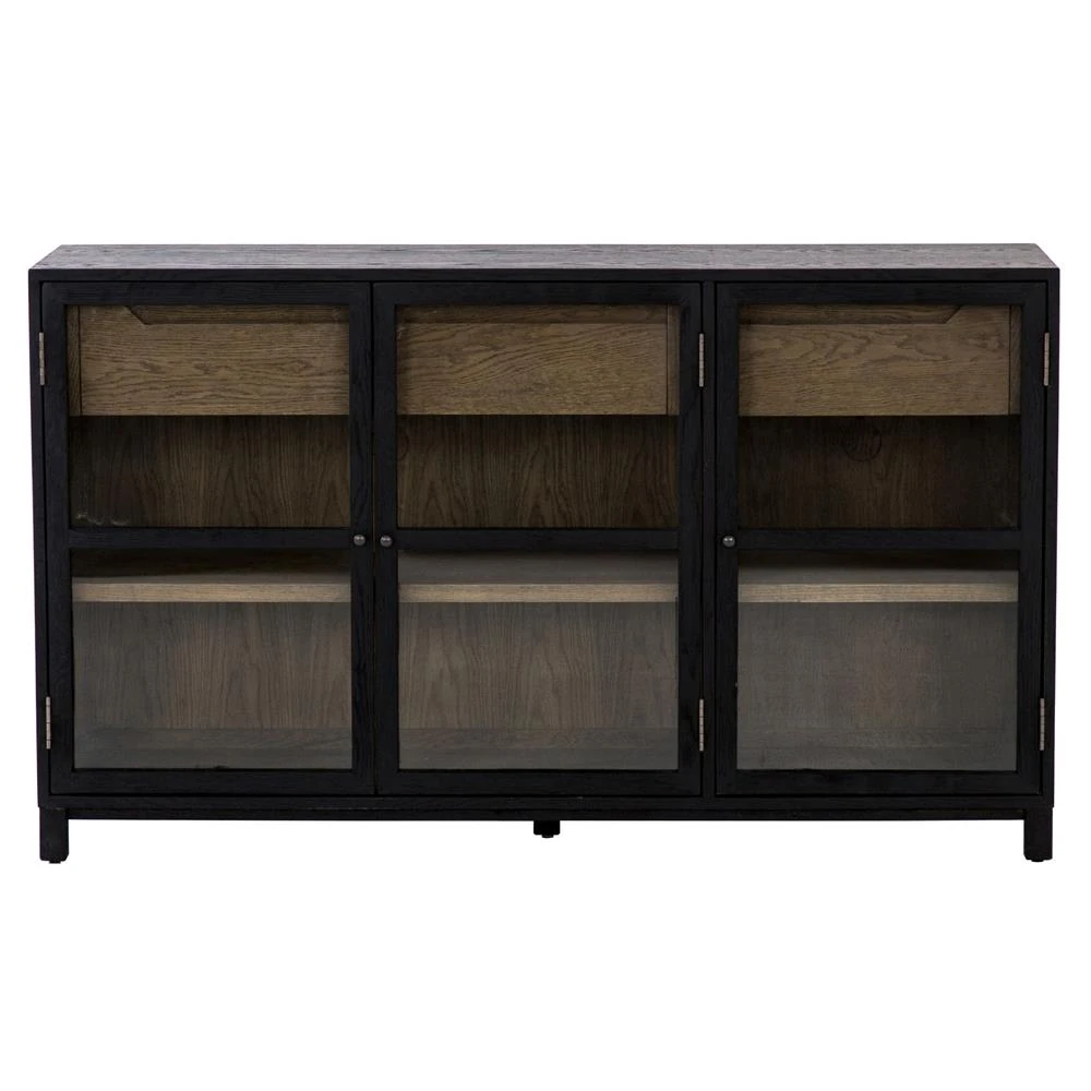Clarence Rustic Lodge Matte Black Oak Wood Clear Glass 3 Door Sideboard
