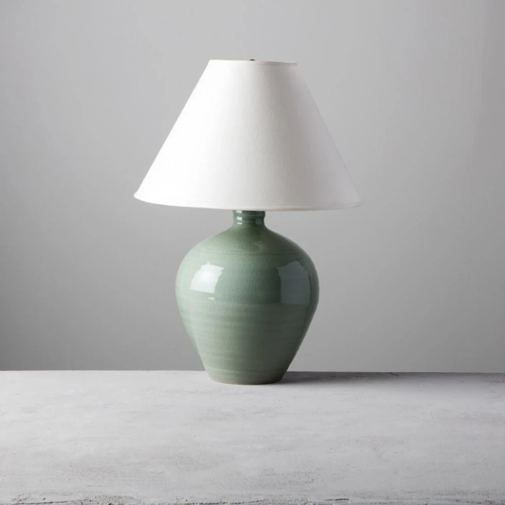 Simon Pearce Belmont Modern Empire Shade Crackle Celadon Pottery Table Lamp