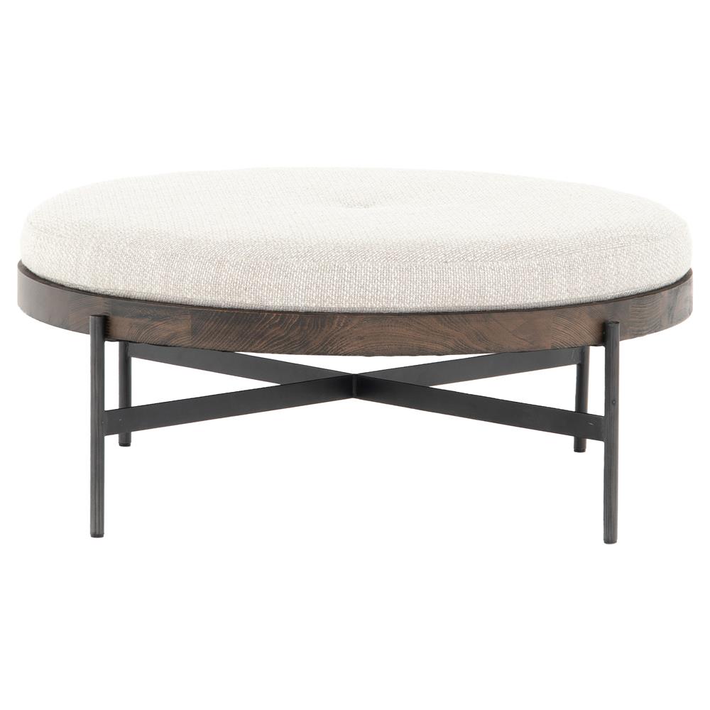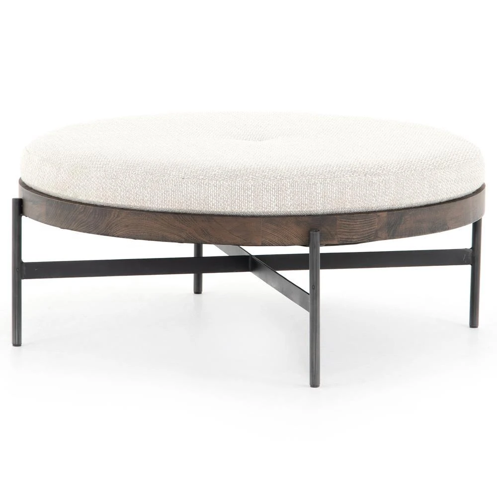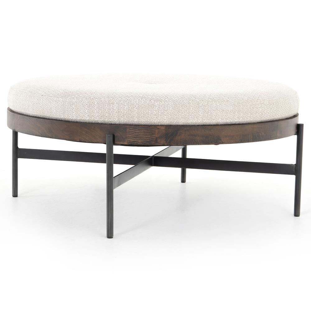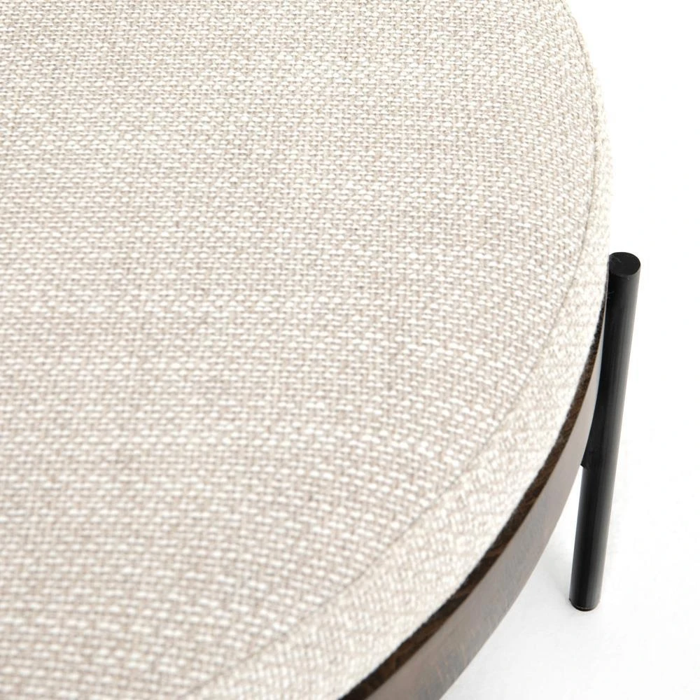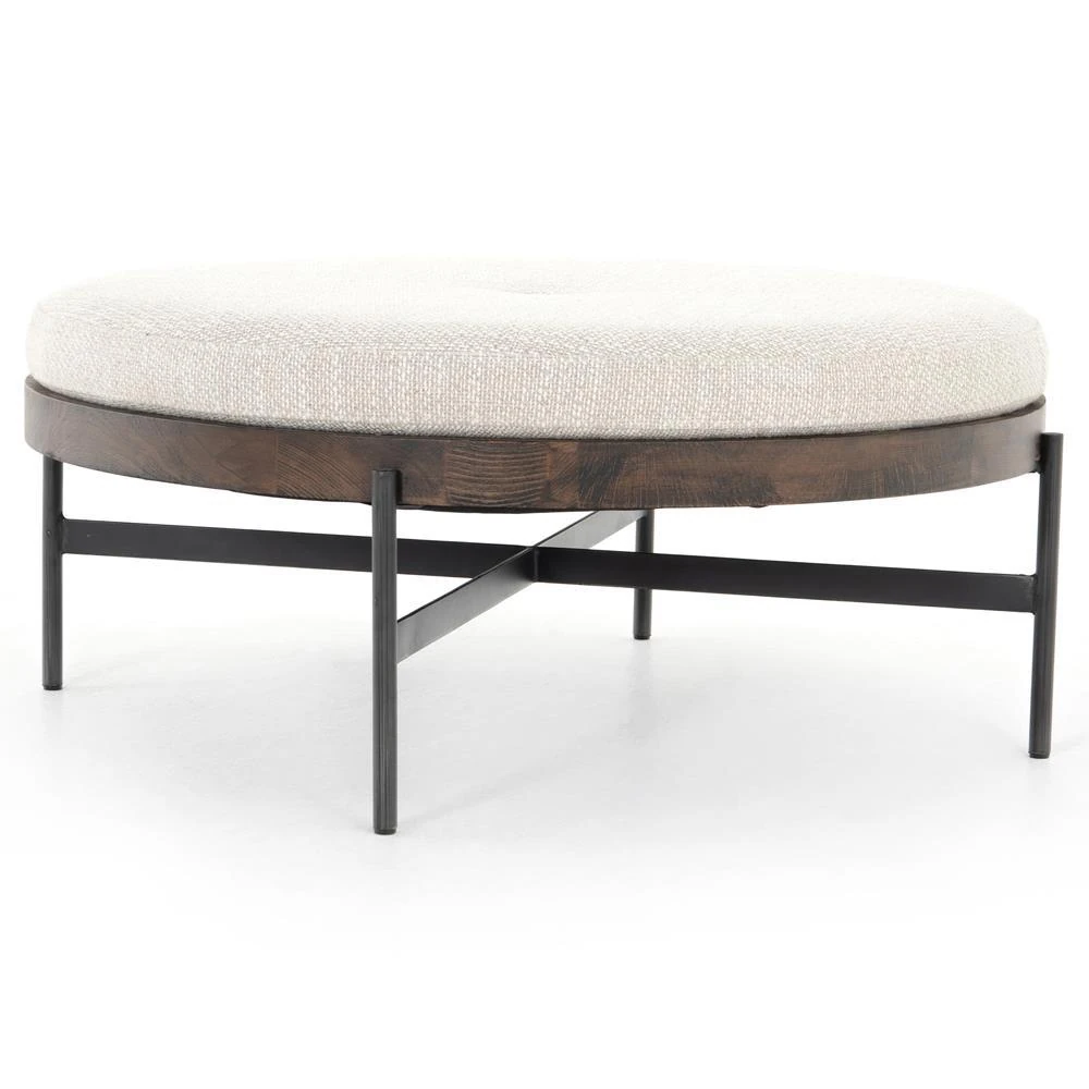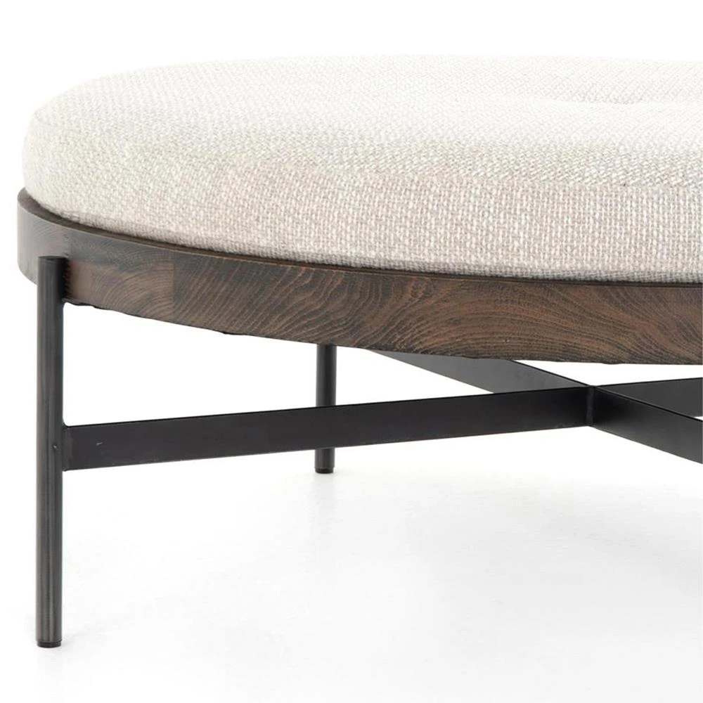 Leith Modern Classic Cream Linen Boulder Brown Wood Round Ottoman
