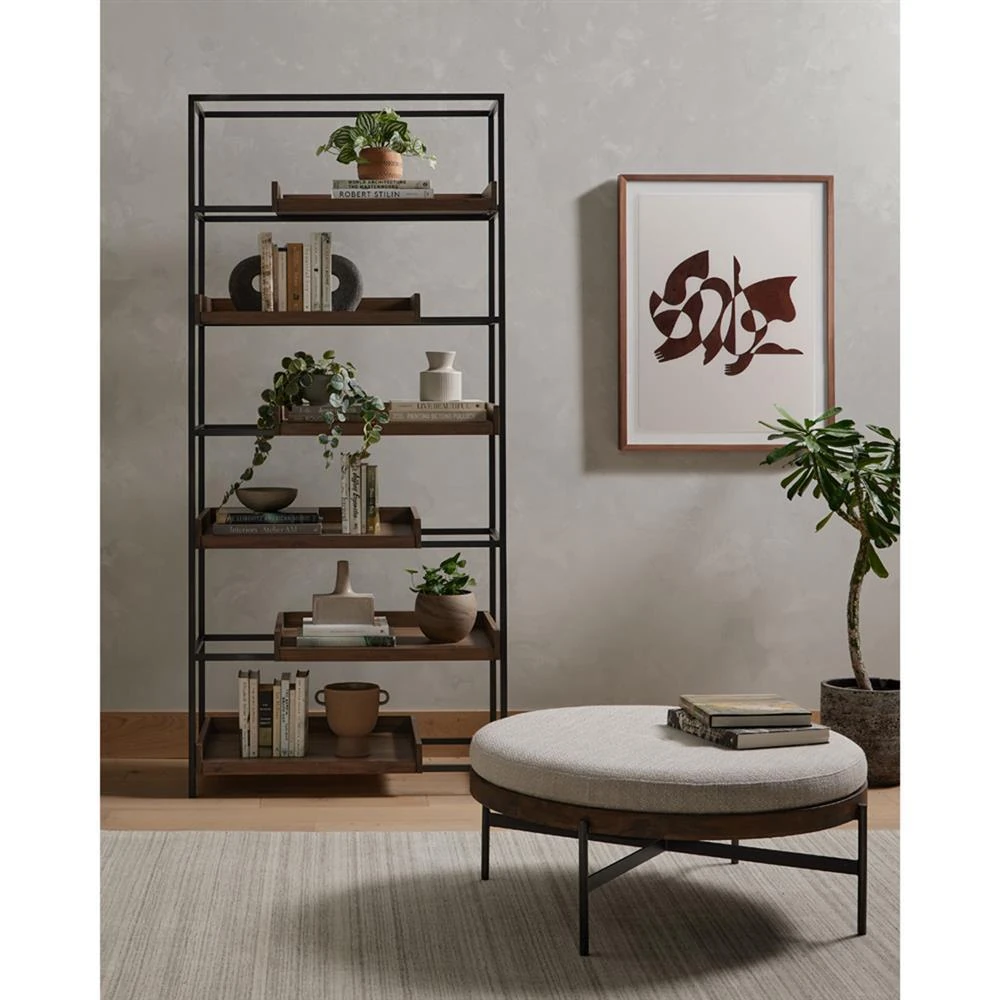 • Leith Modern Classic Cream Linen Boulder Brown Wood Round Ottoman|Kathy Kuo Home