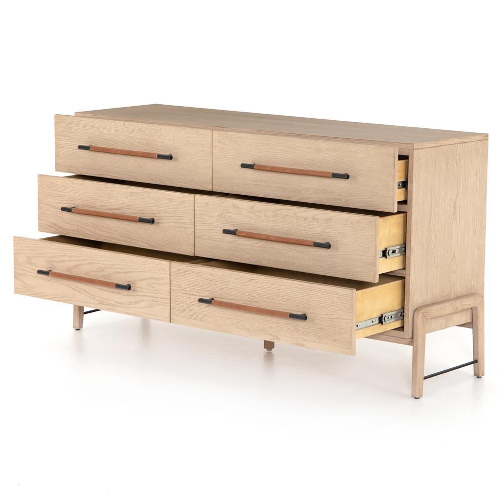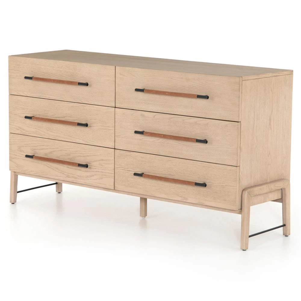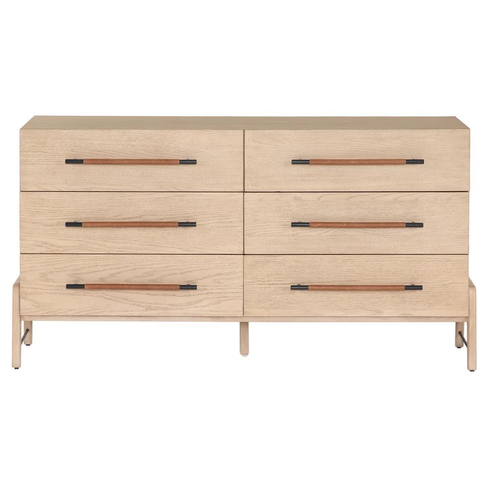 Add coveted storage space to your bedroom with the Matthew six-drawer dresser. Iron drawer pulls are wrapped in tan top-grain leather, ... more