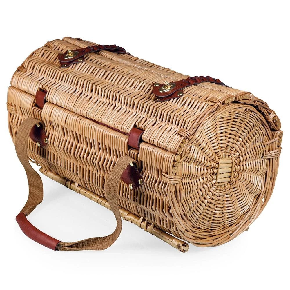 • Features woven-willow double lids, a fully-lined interior, and canvas carry straps