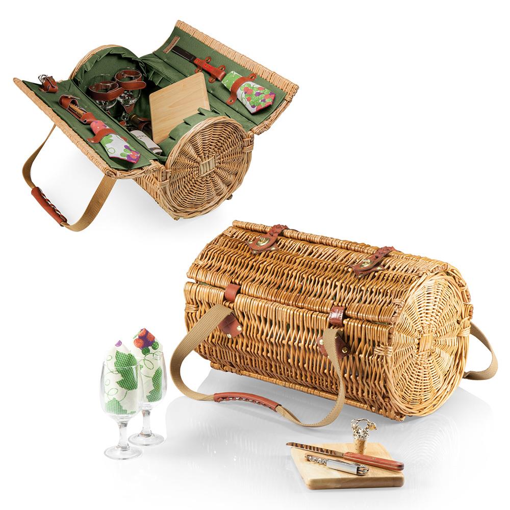Surset French Brown Willow Green Picnic Basket with Serverware for 2