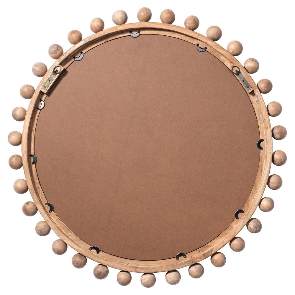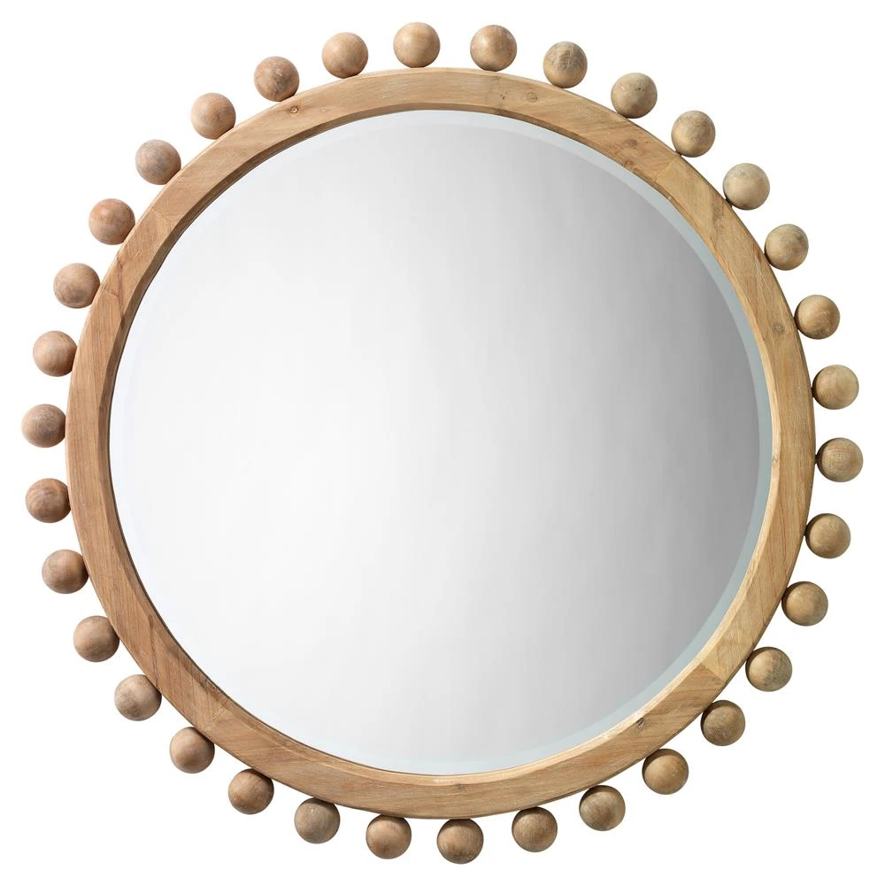 This Brooke Coastal Beach Natural Wood Beveled Round Wall Mirror is ornamented with nearly three dozen small wood spheres. The sophisti ... more