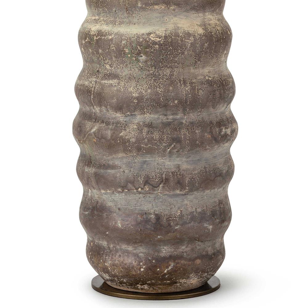 • Hand-applied, matte glaze that produces various shades of earthen brown and tan; Features a repeating curves on base