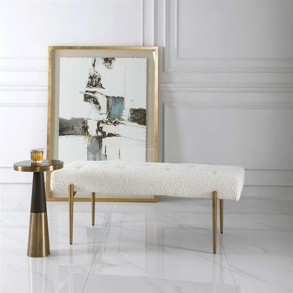• Usman Mid Century Beige Performance Antique Brass Steel Entryway Bench|Kathy Kuo Home