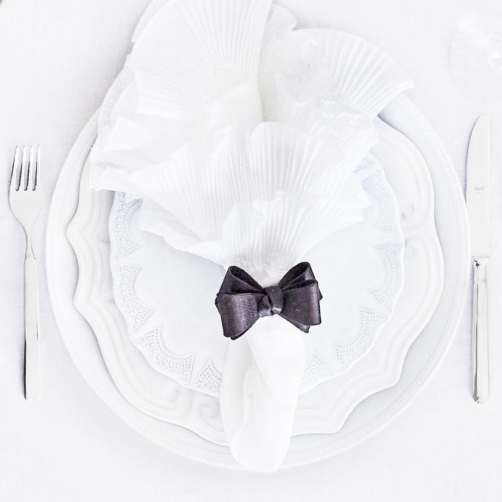 • Finish: Dinner Plate, Salad Plates, Charger and Napkin: white; Wine Glass and Champagne Flute: clear; Napkin Ring: black