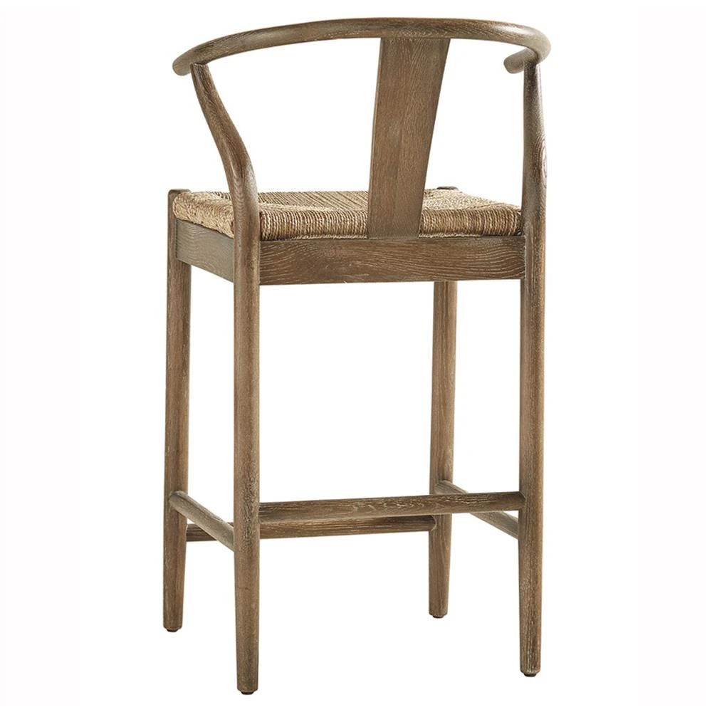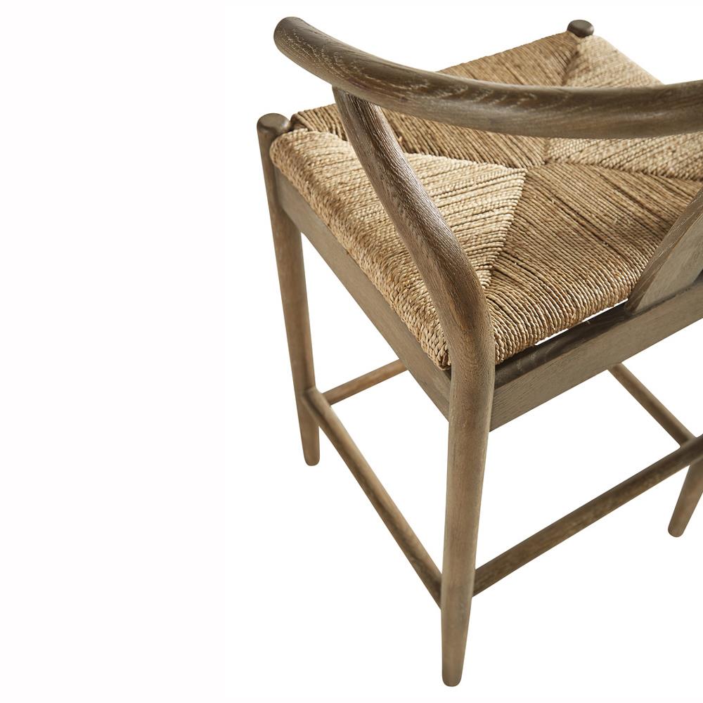 • Zhuri Coastal Beach Light Brown Oak Wood Frame Woven Seat Wishbone Counter Stool|Kathy Kuo Home