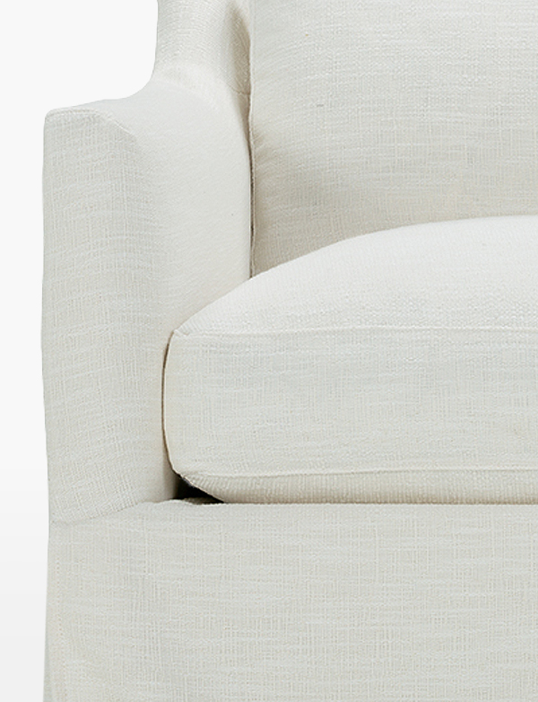 Gently curved lines form a casual silhouette on the Madeline slipcovered swivel chair, a versatile piece that brings relaxed sophistication to any room. Soft yet supportive, the seat cushion is designed for supreme comfort, with a foam core surrounded by a blend of fiber, down, and feather fill. The loose back pillow and seat cushion make it easy to fluff and enliven the shape as needed. Choose from washable slipcover fabrics in a variety of serene hues.